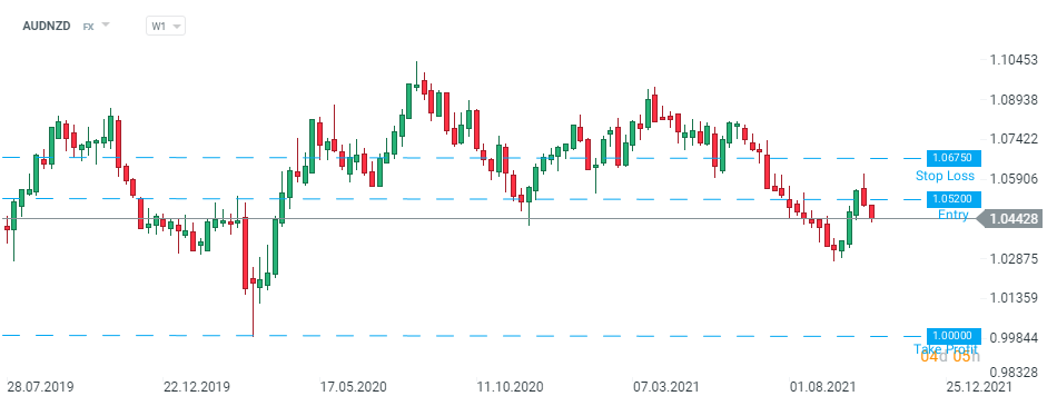 Credit Agricole recommends placing a limit order to short on AUDNZD at 1.0520 with a target of 1.0000 and a stop loss order placed at 1.0675 Source: xStation5
