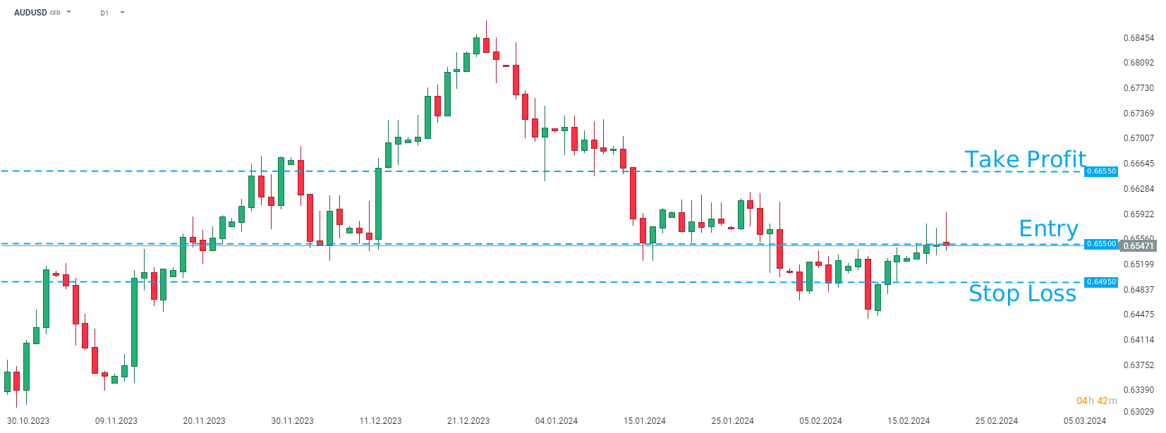 IFR recommends taking a long position on AUDUSD at market price with a target of 0.6655 and a stop loss order placed at 0.6495. Source: xStation5