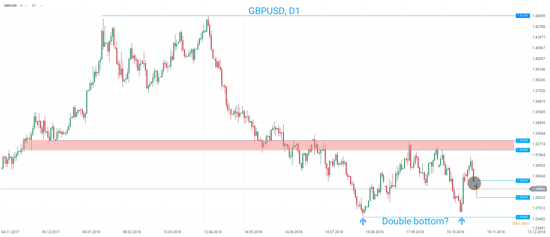 The bigger picture for GBPUSD shows that the market is still broadly in a range from 1.2660-1.3310. A possible double bottom may be forming. Source: xStation