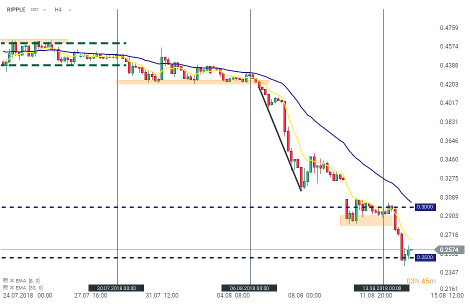 RIPPLE plunged below $0.25 for a while. The cryptocurrency is trading a notch above this mark at press time. What’s more, the cryptocurrency has reached the new 2018’s low recently. Source: xStation5