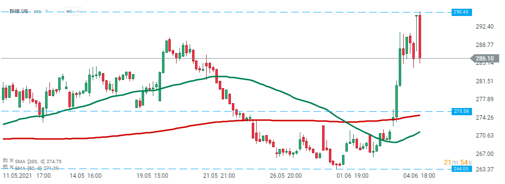 Biogen (BIIB.US) stock was halted for trading at $286.10 and awaits reopening. Source: xStation5
