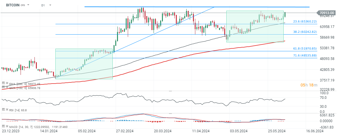 Despite weak sentiments on US stock market and drop of both silver and gold, we can see surprisingly strengthening Bitcoin today. It's hard to find direct reason of that situation because even so-called memstocks deepen declines today and investors risk appetite seems to be low. But still, Bitcoin may benefit from speculating positioning. On the other hand, we can see that futures on USDIDX (US-dollar) erased half of today gains which may be a signal that 'dovish' macro signals from weakening US economy may fuel appetite for Bitcoin, as bond rise again with treasury yields falling. Also, today 'bullish' session on BTC may be a signal that its correlation with other assets such as stocks, bond or yields is falling, making BTC sometimes 'separate' asset, with potential of generating 'alpha'. On the other hand, it's still unclear will this momentum be maintained in the following hours and days, because still important resistance zone is set on $73.000 and $75 000 levels.