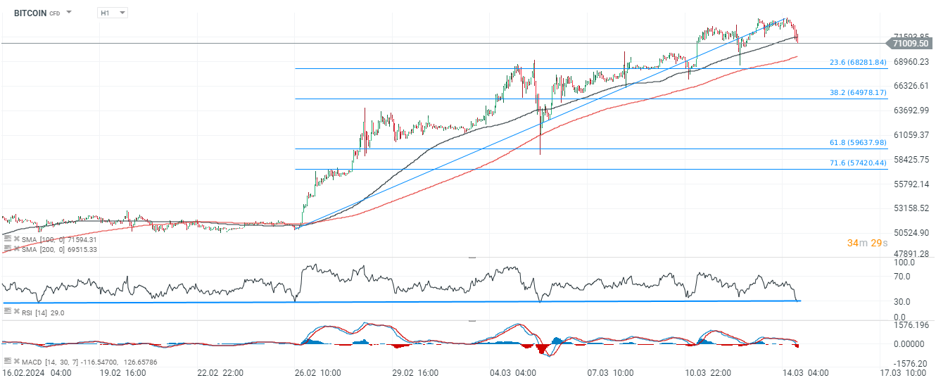 The largest cryptocurrency, Bitcoin, is losing about 3% today and has fallen below $71,000. The broader crypto market's declines coincide with today's weaker sentiments in the indices. The yields of 10-year U.S. treasuries have risen in the last three days from around 4.1% to nearly 4.29%. Today's data from the U.S. economy showed that February's PPI inflation rose more strongly than expected, complementing Tuesday's 'hawkish' CPI report, which indicated persistent pressure in services excluding rents.