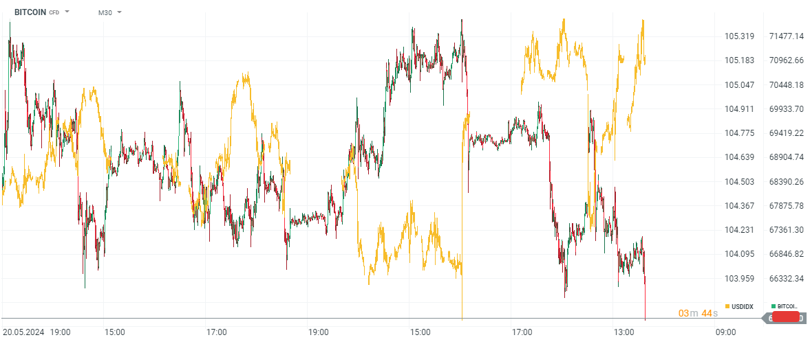A strong dollar (USDIDX, yellow chart) has helped push down the price of Bitcoin over the past few, trading sessions.