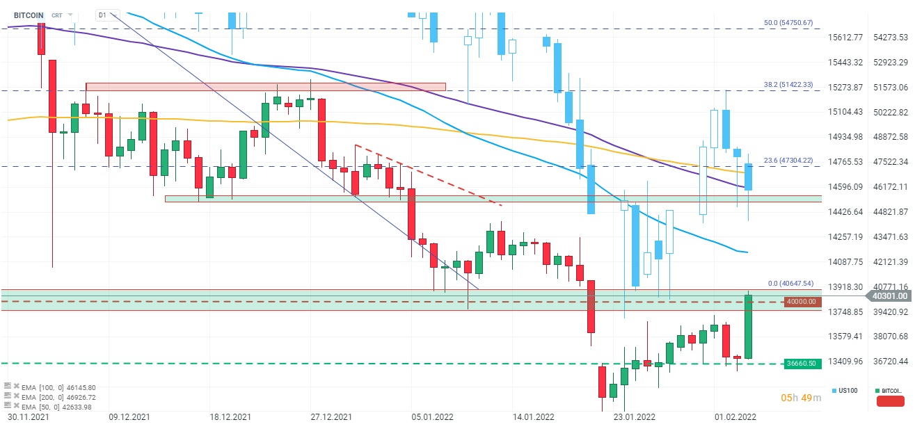 Interestingly, in the chart below we can see that the recently visible strong correlation with the Nasdaq (US100) index listing is giving the first signs of fading. Bitcoin is climbing below the psychological barrier of USD 40,000 and if it manages to permanently go beyond this ceiling, we can look for the next important barrier to overcome in the area of USD 44,000-46,000.
