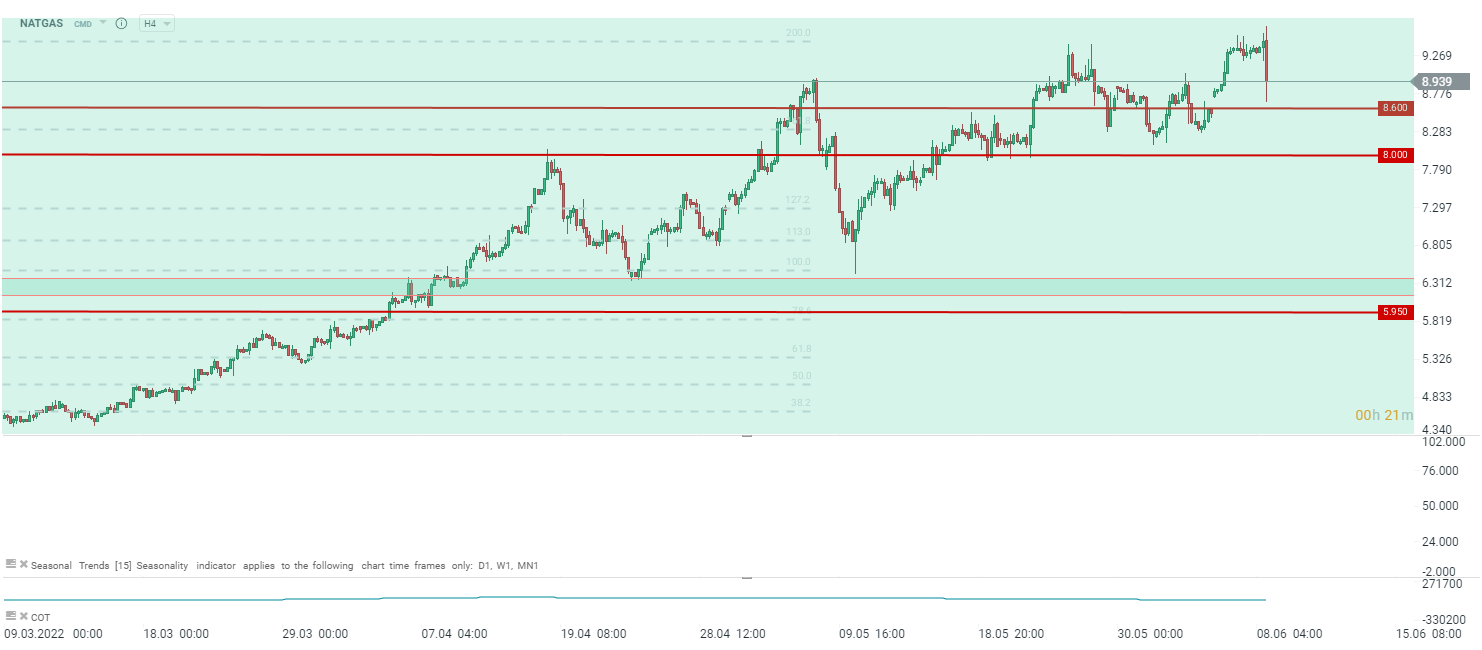 NATGAS retreated below $9 at one point in response to news of an explosion at the infrastructure of Freeport, an LNG export company. If the news turns out to be true, there could be a 2 bcfd gas export halt, which would mean a significant overbuild in the stock in the near term. Other rumors include tomorrow's inventory report, which would see a triple-digit inventory overbuild, or the potential imposition of an additional tax on traders in the US gas market. Nevertheless, the most likely driver of the gas price is the breakout indicated at the outset.