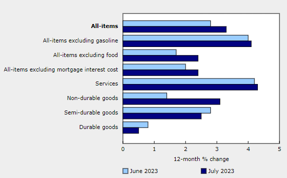 The mortgage interest cost index (+30.6%) posted another record year-over-year gain and remained the largest contributor to headline inflation. The all-items excluding mortgage interest cost index rose 2.4% in July. Source: statcan