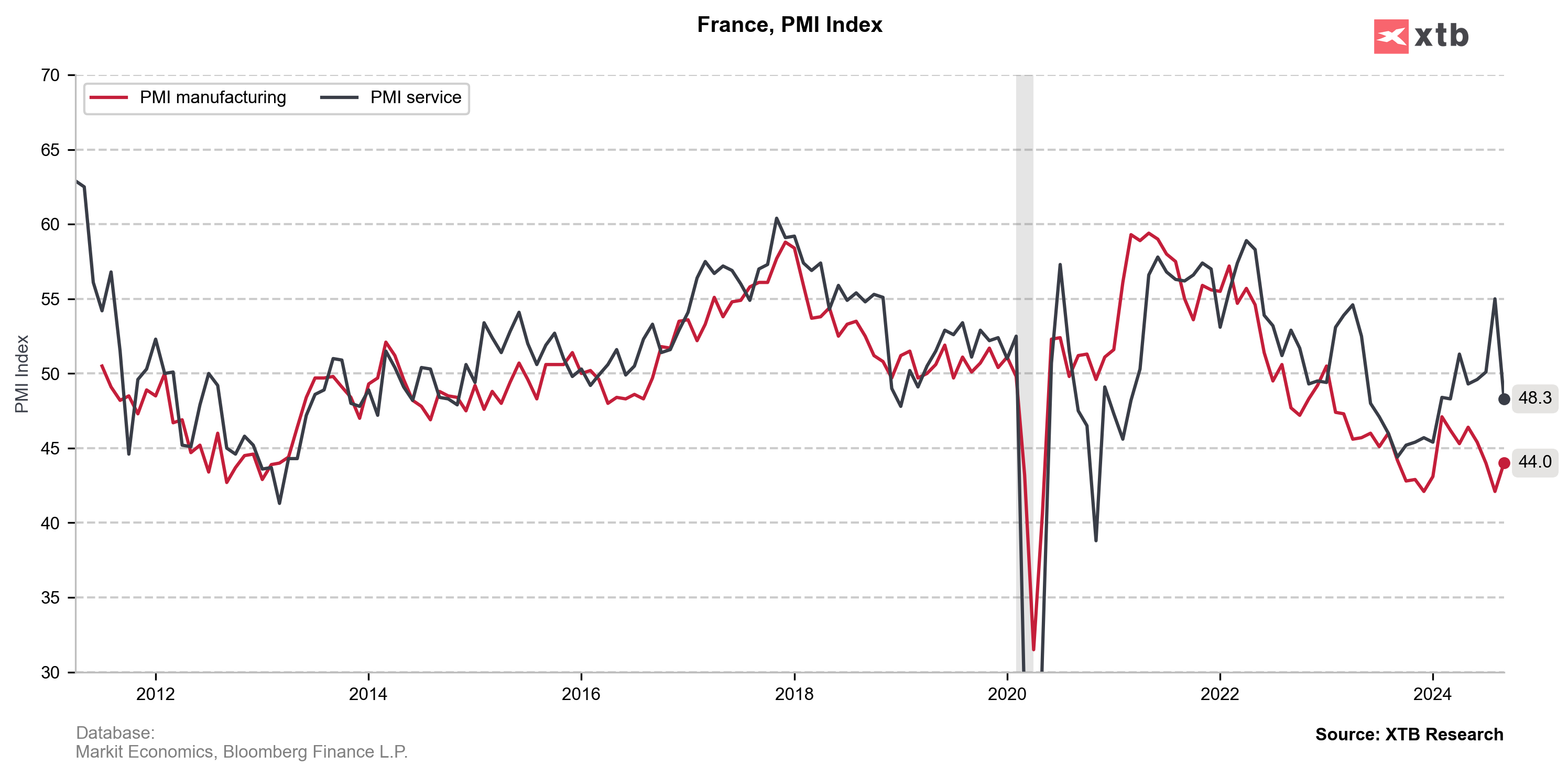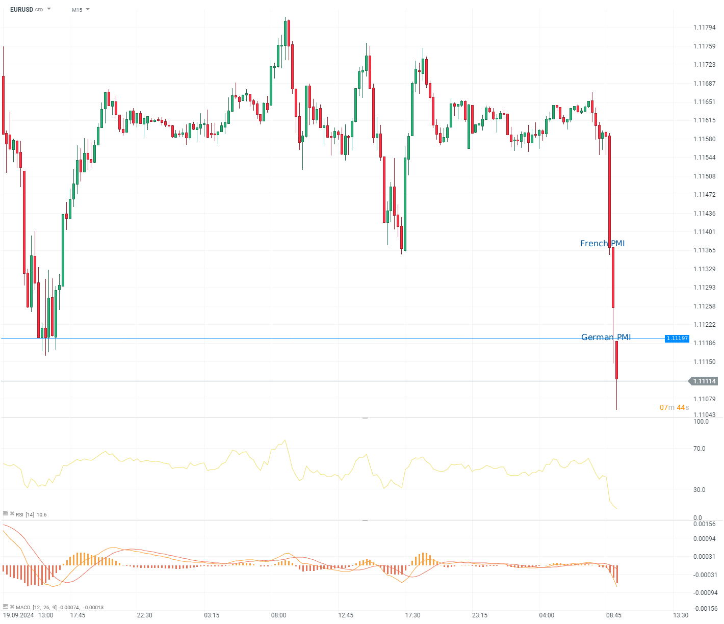 French data turned out to be worse than expected - manufacturing PMI missed expectations, while services index showed a big decline, from 55 in August to 48.3 in September. EUR and European indices slumped following the release.