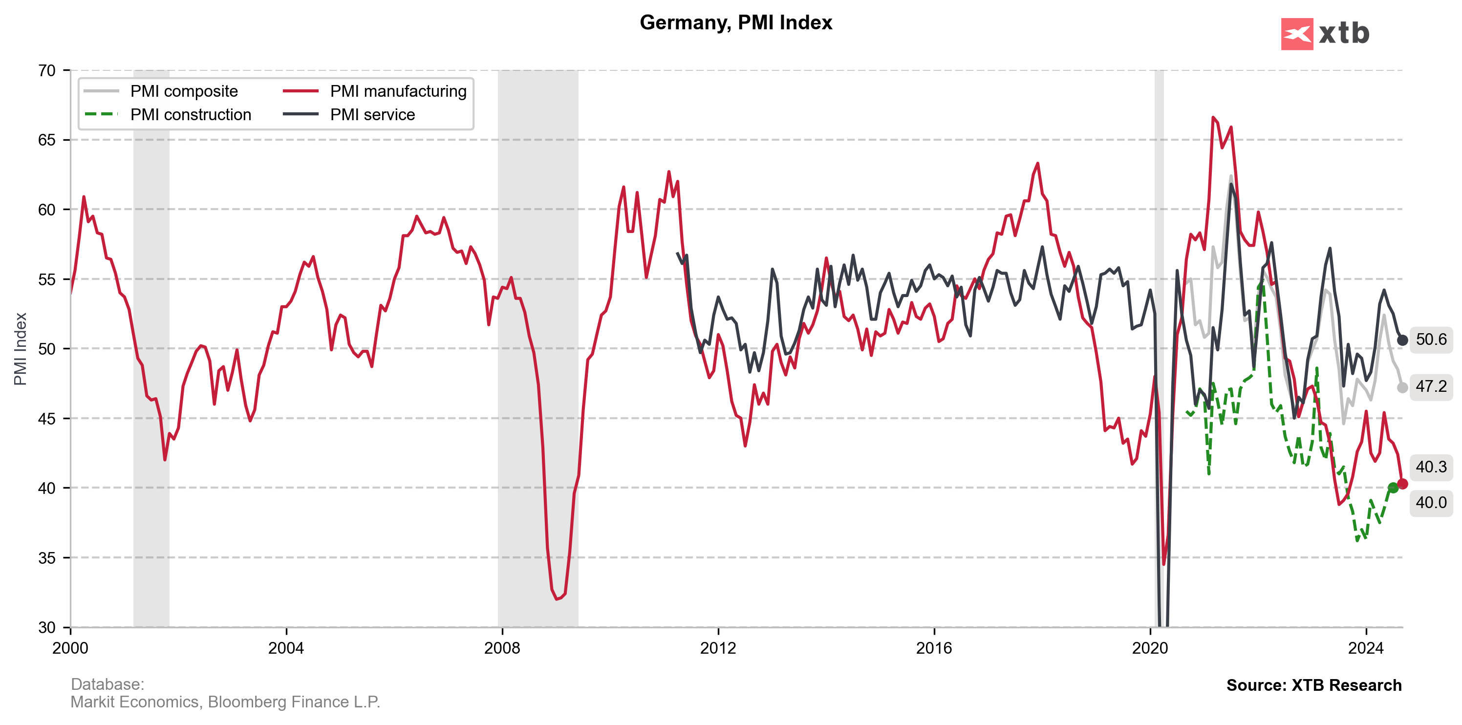 German data turned out to be a disappointment, with both indices missing expectations. However, the services sector managed to remain in expansion territory. EUR and indices from the Old Continent moved lower following release of German data.