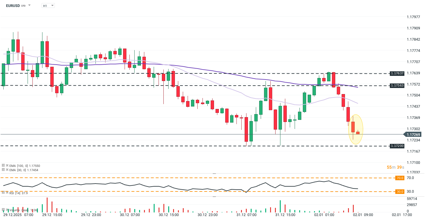 EURUSD extended its losses following the data release after earlier failing near key resistance around 1.1765. The pair has fallen roughly 0.5% over the past week, reflecting broader dollar strength amid more restrained US rate-cut expectations for Q1 2026. Immediate support sits near 1.1720, while a near-oversold RSI (approaching 30) should spark caution before chasing further downside.