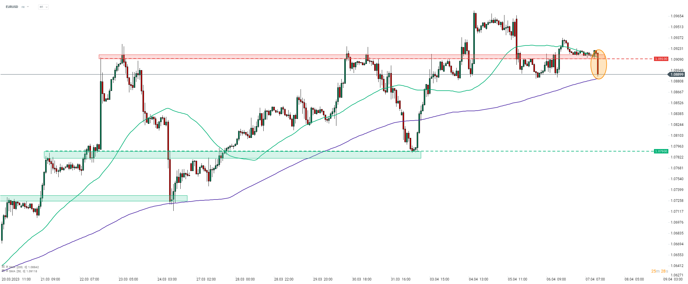 EURUSD is making a break back below 1.0910 price zone following a decent NFP reading. Source: xStation5