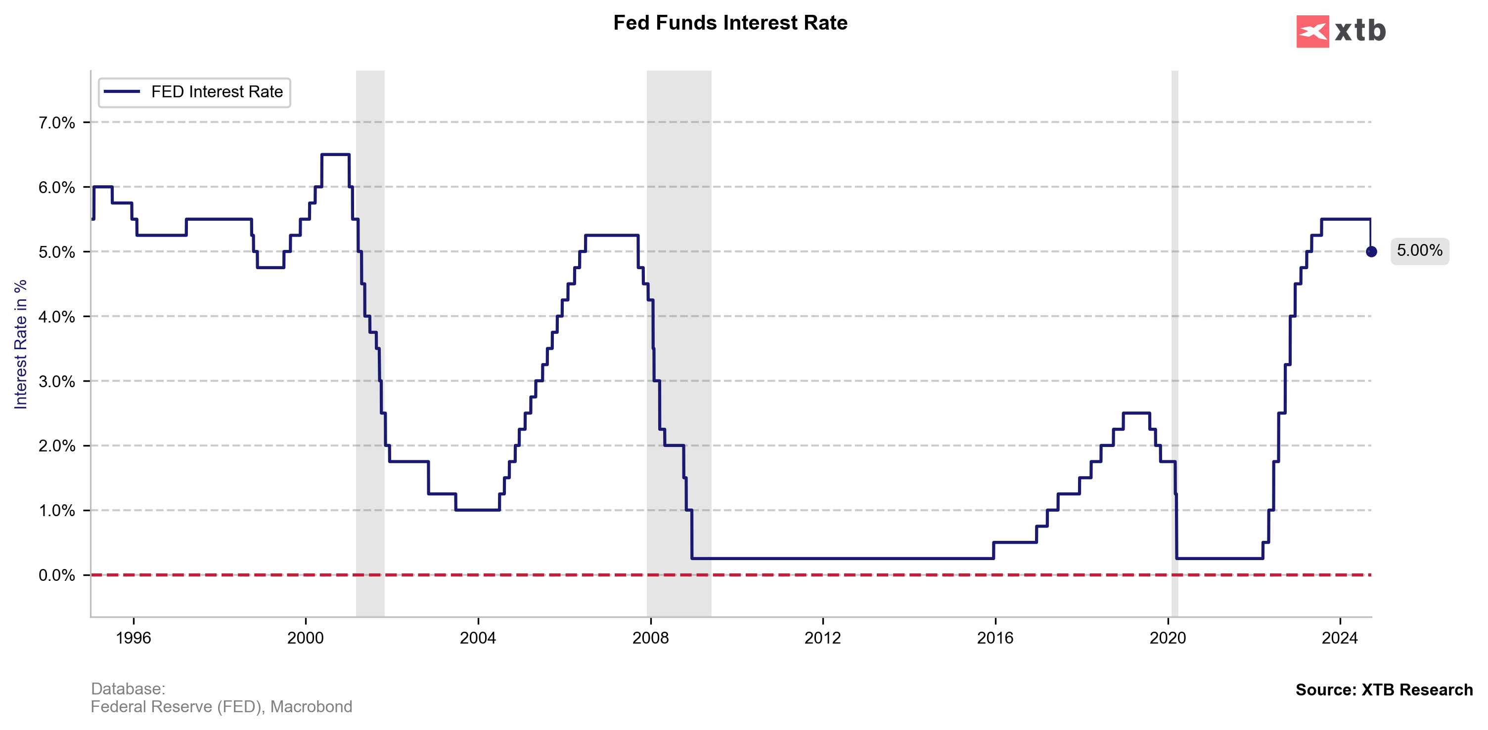 24 projections now effectively sees 2 more cuts with 5 more in 2025 to just above 3% at the end of 2025 which is almost in line with market expectations. Source: Fed, Macrobond, XTB Research