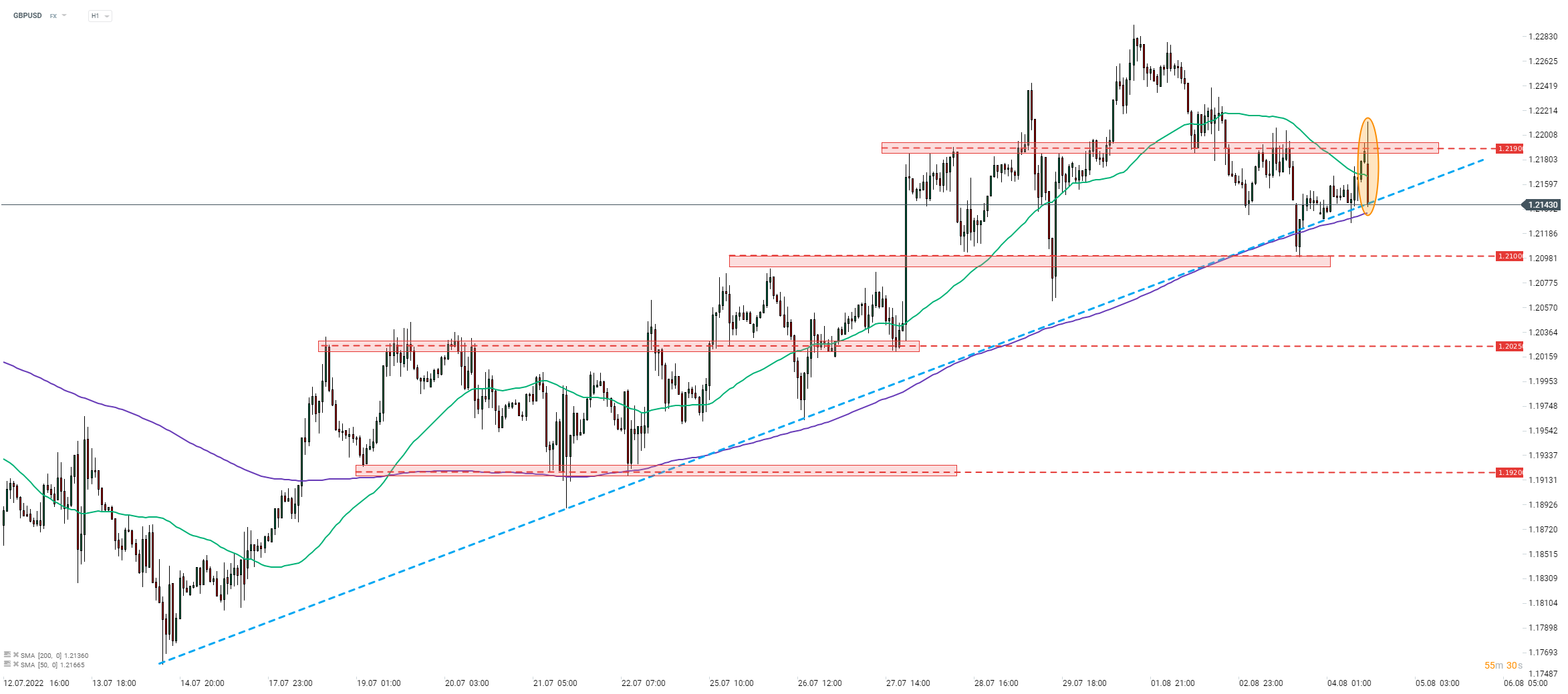 GBPUSD jumped in knee-jerk move but erased gains later on and is now testing short-term upward trendline. Source: xStation5
