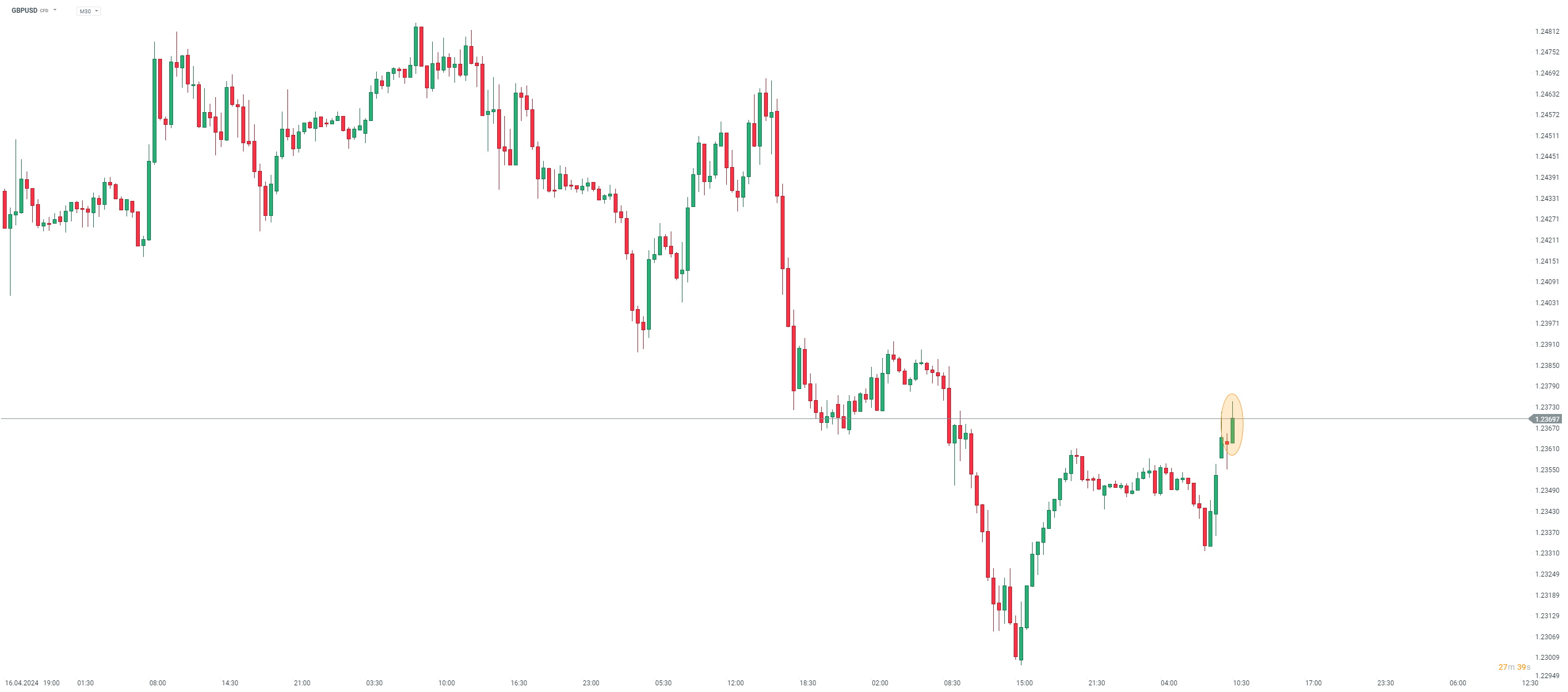 GBPUSD gained following release of mixed flash PMIs from UK. The pair jumped and reached a fresh daily high near 1.2375. Source: xStation5