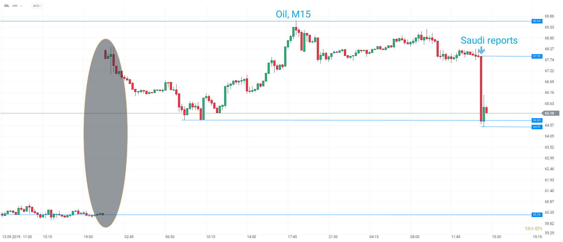 Oil has dropped by over 300 ticks or $3 on the news. The gap from last week’s close at 60.25 remains unfilled. Source: xStation