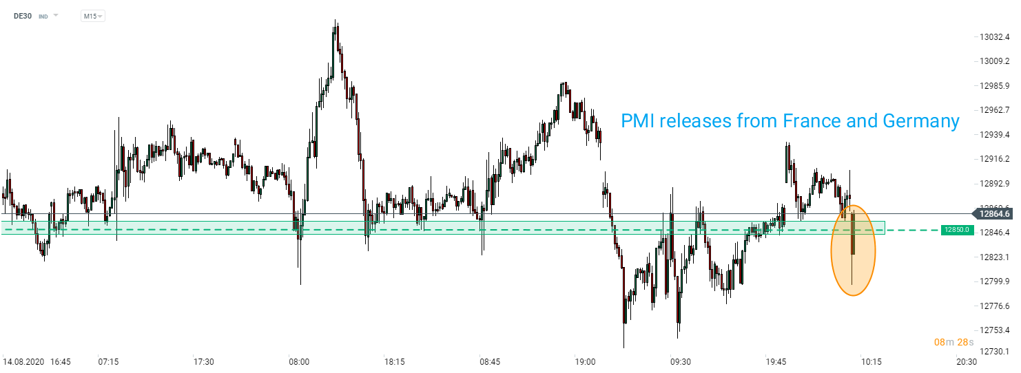 DE30 seesawed around 12,850 pts price zone on the back of French and German PMI releases. Source: xStation5