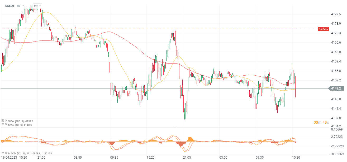 US500 is trading below 4160 points. Right after the publication there was no significant reaction. However, a moment later the index dipped below 4150 points moving away from the upper support line.