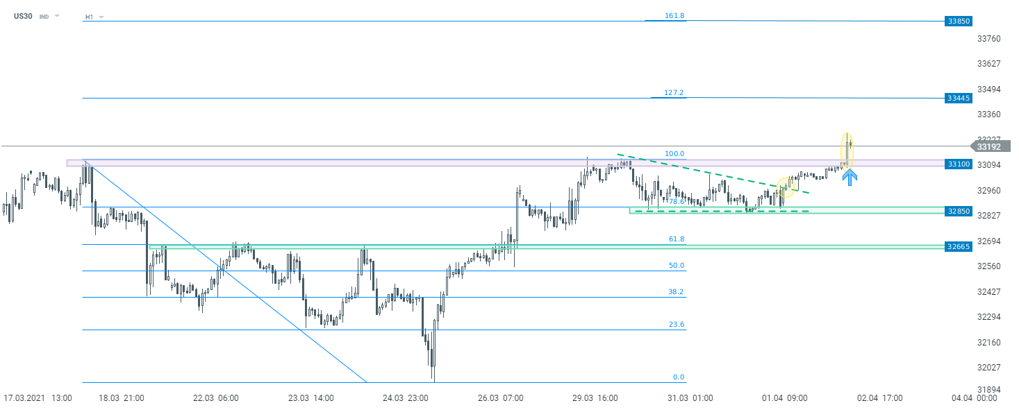 Although the US stock markets are closed today, we saw further increases in the futures market. The contract for the Dow Jones - US 30 index reached fresh all-time highs. This scenario was already supported by yesterday's breakout from the triangle formation, which is marked with green dashed lines. Breaking above the resistance zone around 33,100 pts opens the way for further increases. If the current momentum prevails, then the nearest resistance can be found at 127.2% and 161.8% external Fibonacci retracements, determined on the basis of the recent downward correction.