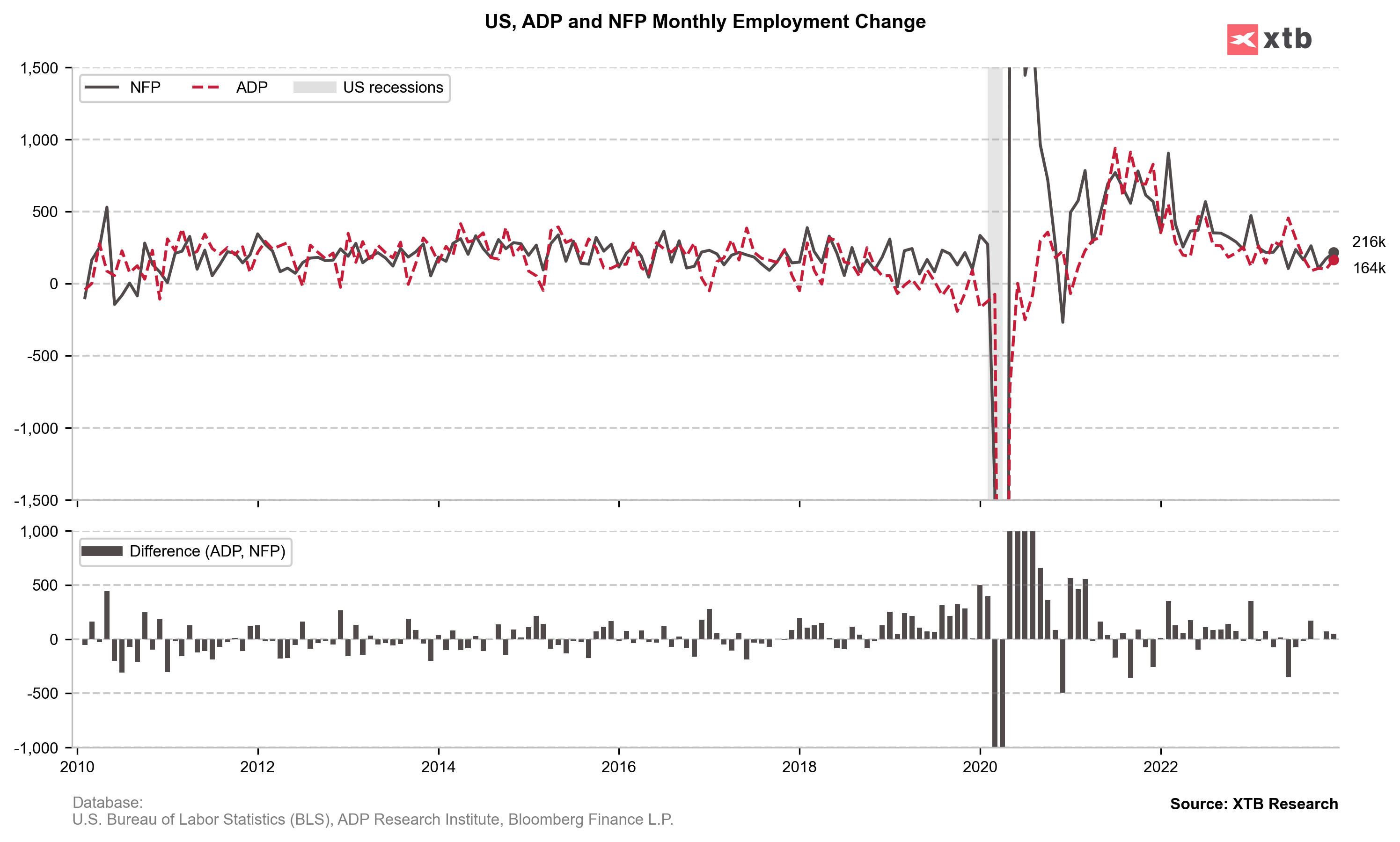 - Private payrolls: 164k vs 130k expected (150k previously)