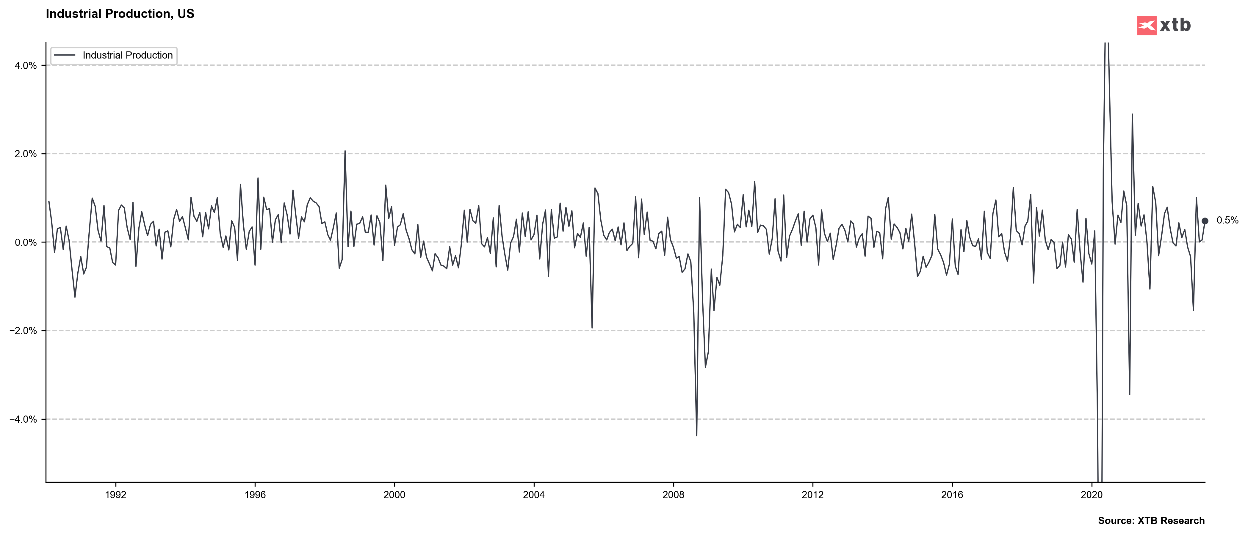 US industrial production increased 0.5% MoM in April. Source: Macrobond, XTB