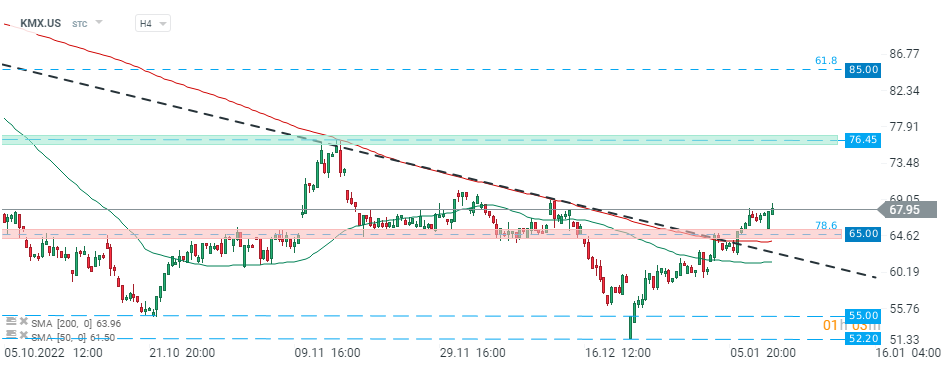 CarMax (KMX.US) shares plunged 53% in 2022, but have risen over 30 % from December lows. Last week price broke above key resistance at $65.00, which coincides with 78.6% Fibonacci retracement of the upward wave launched in March 2020, downward trendline and 200 SMA (red line). As long as price sits above these levels, upward move may accelerate towards major resistance at $76.45, where November highs are located. Source: xStation5
