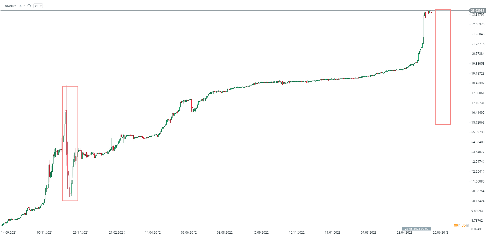 USDTRY continues to trade at elevated levels even in spite of an expected massive CBRT rate hike. Source: xStation5
