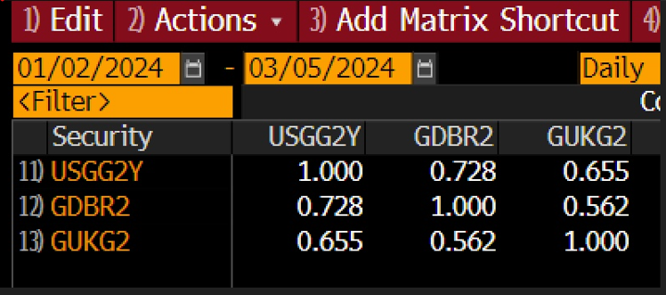 As you can see, the relationship between US and German 2-year yields has been a notch closer since the start of the year, and they have moved together 72% of the time. The more interesting shift is the increasingly positive correlation between the US and the UK 2-year yields, which has increased to 65% from 57% a year ago. This may be down to the improving UK economic outlook for 2024 compared with 2023.