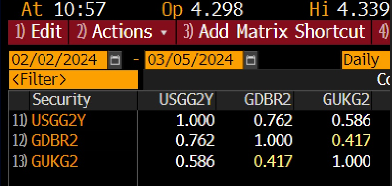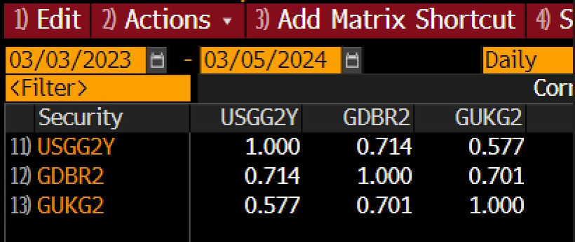 It is rare for different assets to maintain such close correlations for 12 months, but this is understandable since central banks moved in unison to fight inflation during 2023. However, the more recent correlations shed an interesting light on what could come next.