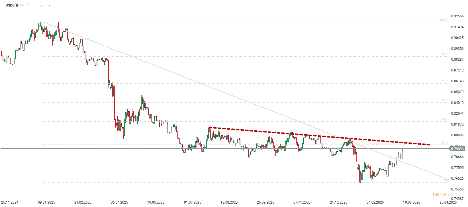 Despite its safe-haven status, the CHF is beginning to lose ground against the USD. However, the pair faces significant resistance at 0.80. Source: xStation5