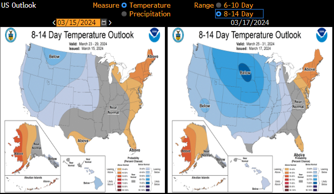 US natural gas prices (NATGAS) launched new week's trading with a bullish price gap and continued to gain during the Asia-Pacific session. The move looks to be triggered by new weather forecasts for the United States. While winter heating season in the United States, which runs from October until the end of March, is almost over, new 8-14 day forecasts point to below-average temperatures across the US mainland, including in key heating regions. This suggests that demand for power, and in turn for natural gas, may increase in the coming days. While pre-weekend forecasts also pointed to below-average temperatures, they are now seen across a broader part of the US mainland.