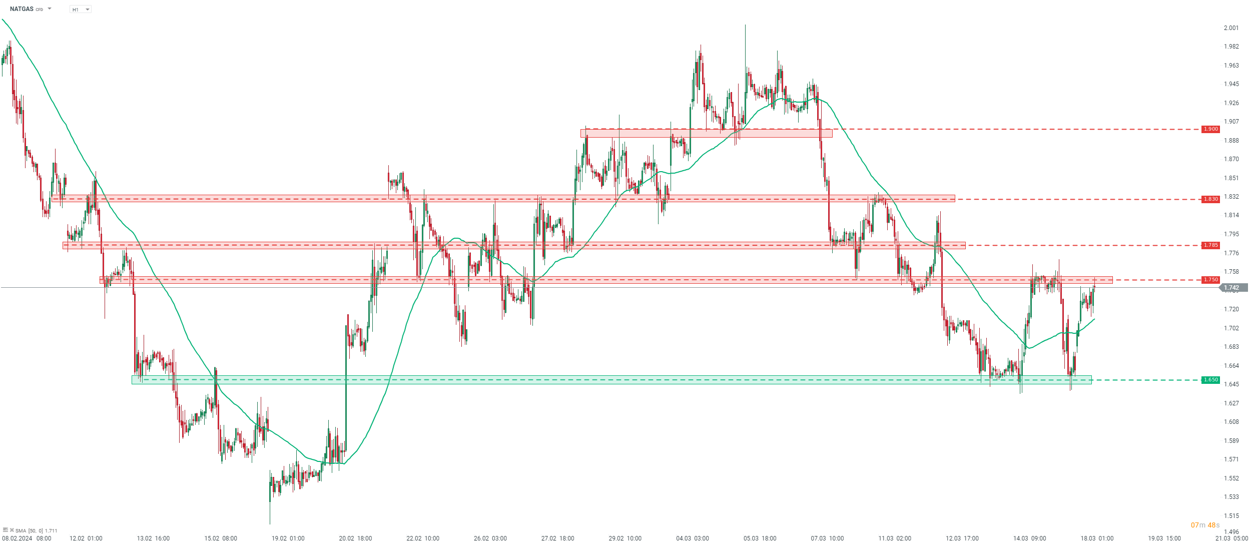 Taking a look at NATGAS chart at H1 interval, we can see that the price bounce off the 1.65 support zone and climbed to the 1.75 resistance, marked with local highs from Thursday and Friday last week. This area is being tested at press time. A break above would pave the way for a test of the 1.785 area.