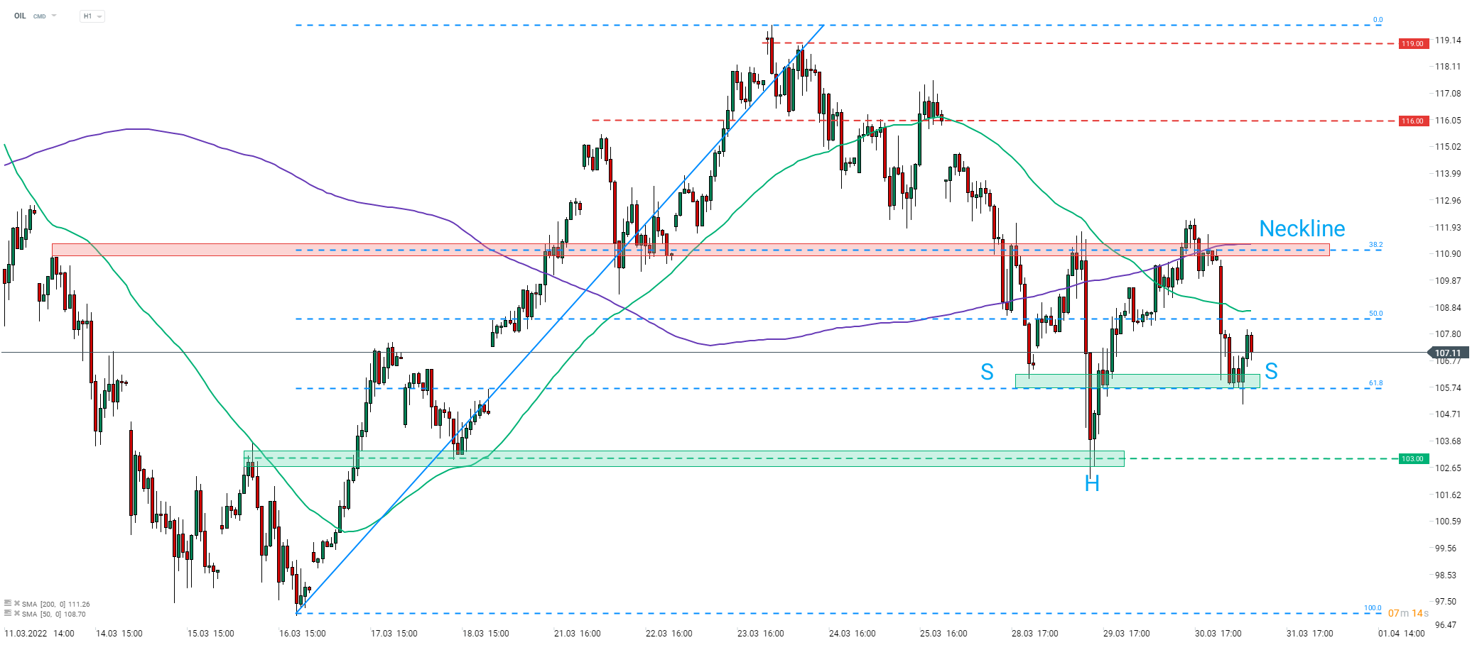 Taking a look at the Brent chart (OIL) at the H1 interval, we can see that an important technical pattern may be building up. Price took a steep dive during the Asian session but declines were halted at the support zone marked with 61.8% retracement of the upward move launched in mid-March. As a result a potential inverse head and shoulders pattern may be building up with shoulderline at the aforementioned 61.8% retracement ($105.70) and neckline at 38.2% retracement ($111.00). Textbook range of a breakout from this pattern suggests a possibility of an upward move to $119.00 - recent local highs. However, a break above the neckline would be needed in order to confirm bullish setup.