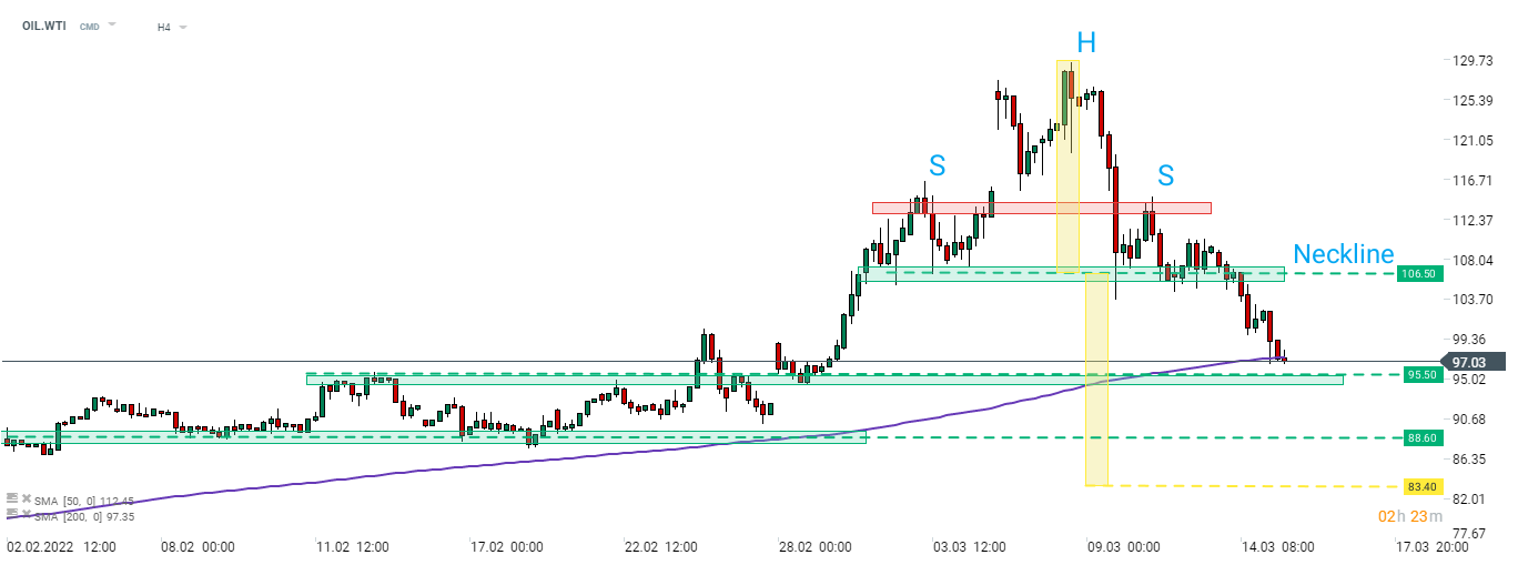 What does the chart tell us? Taking a look at OIL.WTI at H4 interval, we can see that a head and shoulders pattern was painted on the chart. Price broke below the neckline of the pattern at $106.50 and downward move accelerated later on. A 200-period moving average (purple line) is being tested at press time. A break below this moving average may pave the way for a test of the mid-term support in the $95.50 area. An ultimate target for sellers is $88.60 area, marked with a textbook range of a breakout from the aforementioned head and shoulders pattern.