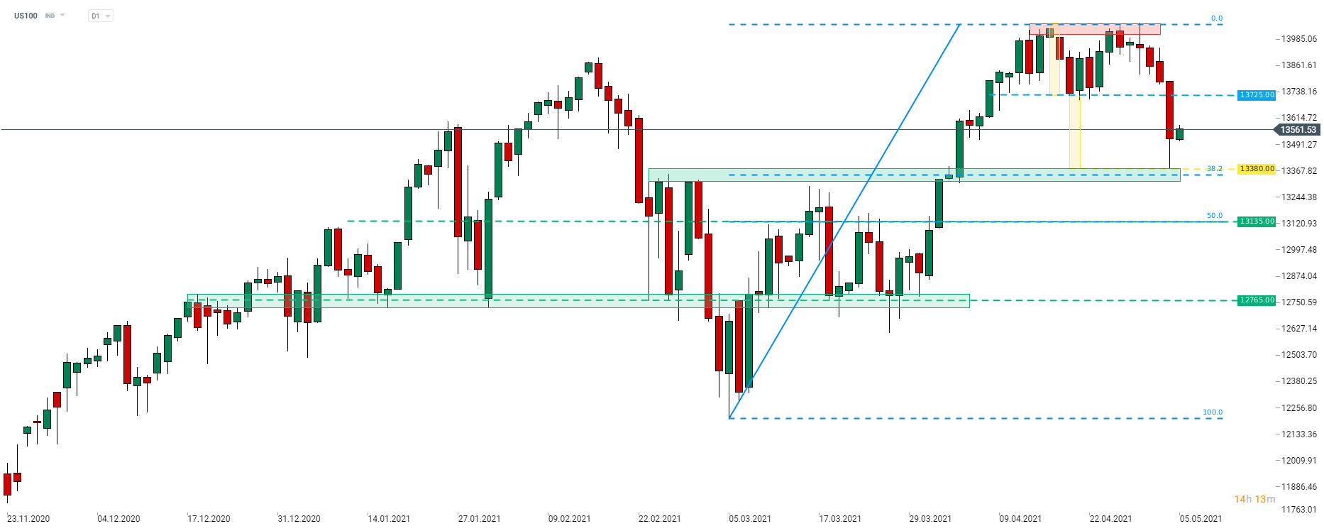 Taking a look at the US100 chart, we can see that the index has found itself in an interesting technical place. Index painted a double top pattern at the end of April and yesterday's plunge pushed the price below the neckline of the pattern (13,725 pts). Moreover, the daily low was reached at around 13,380 pts - the potential target of the double top pattern. Having said that, US100 may be set to extend recovery now. The aforementioned 13,380 pts mark, that more or less coincides with the 38.2% retracement of the upward move started in March can be seen as the near-term support to watch.
