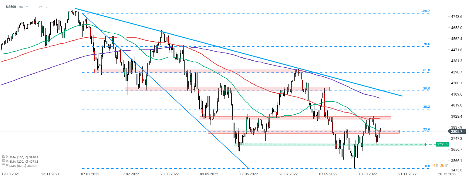 S&P 500 (US500) bounced off the 3,700 pts support zone last week and launched a recovery move. Index climbed above the 50-session moving average (green line) and 23.6% retracement yesterday but momentum faded today. However, should bulls regain control, a test of the swing zone marked with previous price reactions and 100-session moving average (red line) cannot be ruled out in near-term.