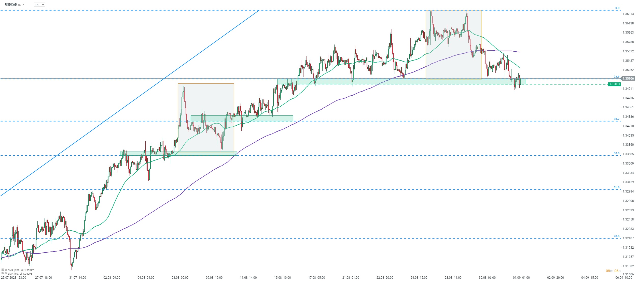 Taking a look at USDCAD chart at H1 interval, we can see that the pair is testing a key support zone in the 1.3500 area. This zone is marked with previous price reactions, lower limit of the market geometry as well as the 23.6% retracement of the upward move launched in mid-July 2023. A break below this area would be a strong hint that a bearish trend reversal may be underway. Whether the pair 'makes or breaks' it may be decided around 1:30 pm BST with data setting the direction for the pair.