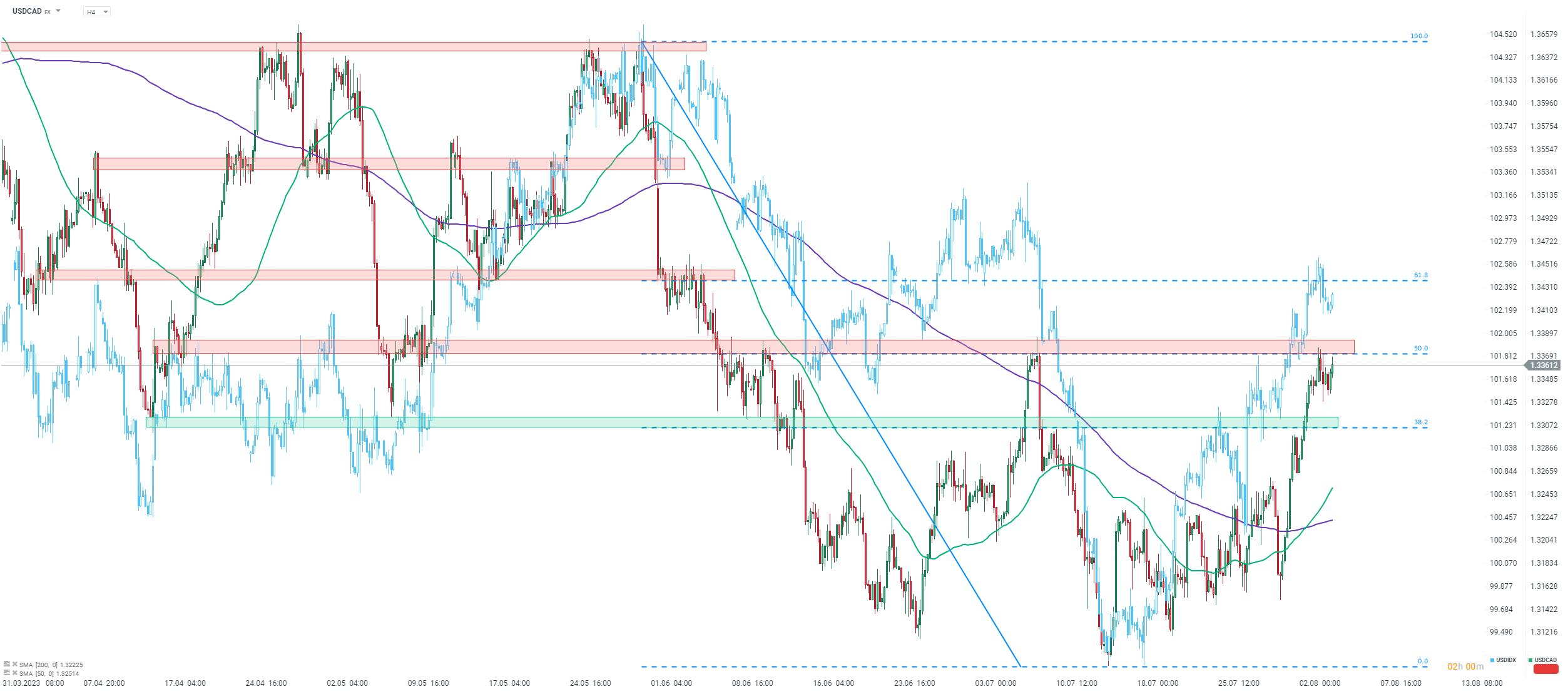 Taking a look at USDCAD chart at D1 interval, we can see that the pair has experienced strong gains recently, driven by strengthening of US dollar (USDIDX - light blue overlay). However, advance was halted after the pair reached resistance zone ranging above 50% retracement of the downward move launched at the turn of May and June 2023 (1.3370 area). This is a price zone that had halted advance in early-July as well. A strong US report combined with weaker Canadian data could trigger a break above the aforementioned 1.3370 area. In such a scenario, the next resistance to watch can be found ranging above 61.8% retracement (1.3440). On the other hand, should we see CAD gain against USD - drop in USDCAD - the support level to watch can be found at 38.2% retracement (1.3300 area).