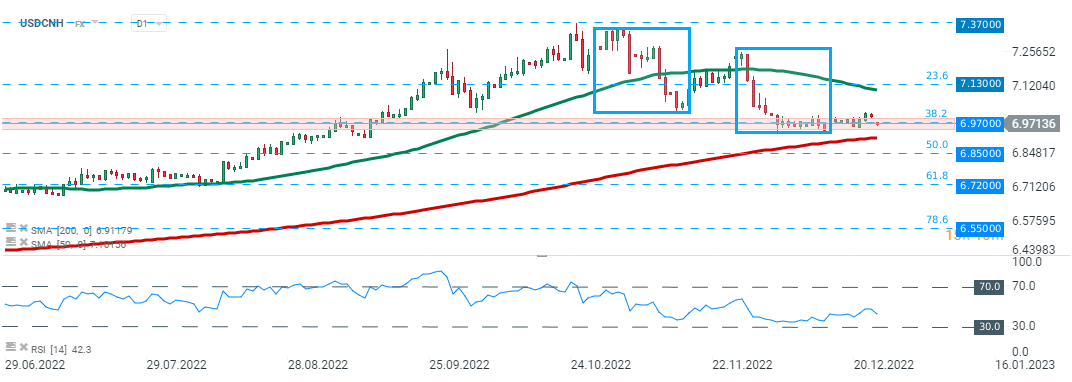 Chinese currency strengthened on Tuesday after Beijing announced that it would drop Covid-19 isolation measures for inbound travelers starting in early January, raising hopes for a wider economic reopening. Health authorities also said that China’s Covid management will be lowered to the less strict Category B from the current top-level Category A. These news overshadowed recent data, which showed industrial profits in China dropped 3.6% during the first 11 months of the year to 7.7 trillion yuan, accelerating from a 3% decline in the January-October period. China’s economic growth was just 3% in the first three quarters of 2022 and is expected to remain around this level for the full year, which is one of the poorest performances in almost half a century, according to Reuters.
