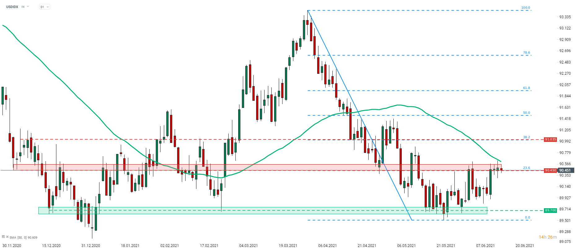 Taking a look at the US dollar index (USDIDX), we can see that price climbed recently and tested the resistance zone at 90.450, marked with a 23.6% retracement of the drop started at the beginning of Q2 2021. A hawkish message from the Fed could help USDIDX break above this zone. In such a scenario, the next resistance to watch can be found at 38.2% retracement (91.035). On the other hand, should the Fed maintain a dovish tone (by for example not making major changes to dot-plot), USD may take a hit with the US dollar index pulling back. In such a scenario, the main support to watch is the lower limit of recent range (89.70).