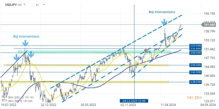 Japanese Yen loses another 0.15% against the USD today, reaching new highs at 161.700. Global market confidence in the Japanese currency is declining, as it has already lost 13.20% this year. At the same time, the yen is losing global recognition as a safe-haven asset during tough times. The nearly 40% devaluation against the dollar has been ongoing since early 2022, when the rate was just 115.000.
