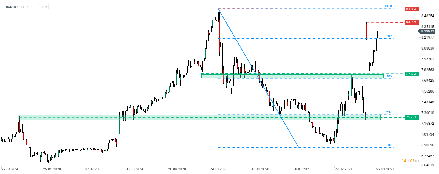 Taking a look at USDTRY chart at D1 interval, we can see that the pair has broken above the 78.6% retracement of a downward move started in November 2020 and is slowly approaching a recent high at 8.41, reached after firing of CBRT Governor last week. The pair trades around 3.5% below its all-time high at around 8.5670.