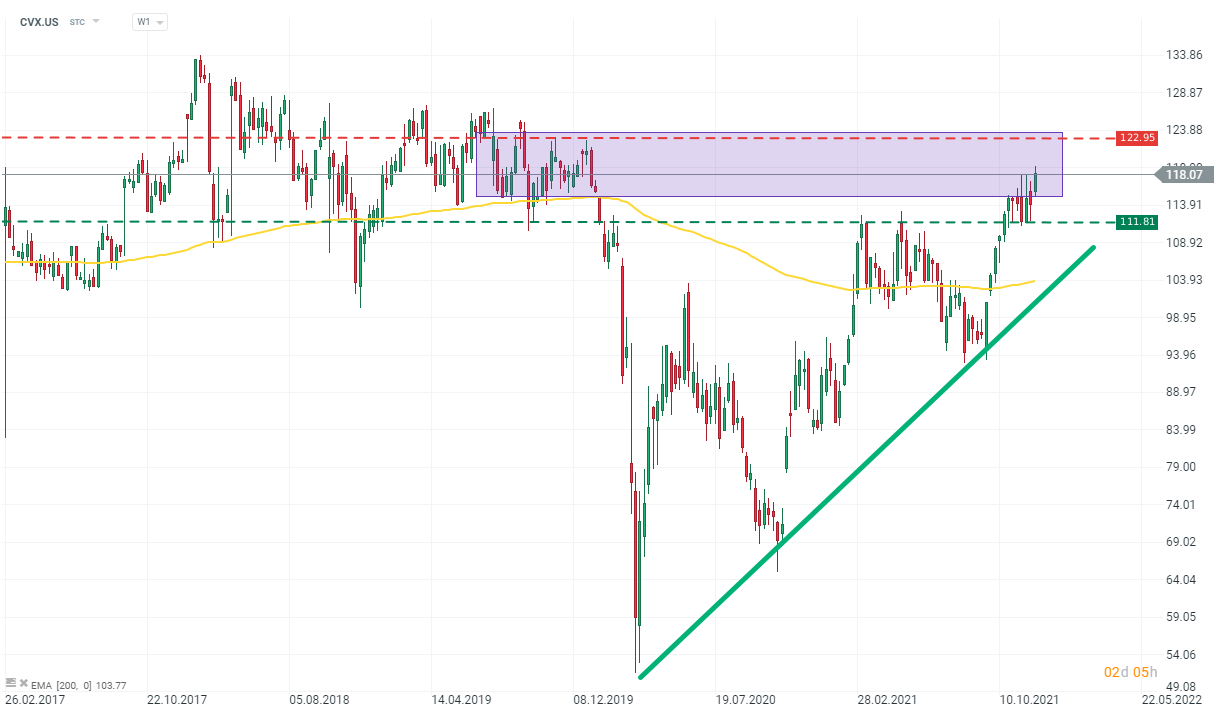 Chevron (CVX.US) stock chart, interval W1. Share prices have been moving in an uptrend since the beginning of the crash caused by the emergence of the Covid-19 outbreak. The stock is trading close to local peaks from the end of 2019, near $123 per share. Closest fundamental support is the level of $112 per share, from which the price has bounced many times. Source: xStation 5