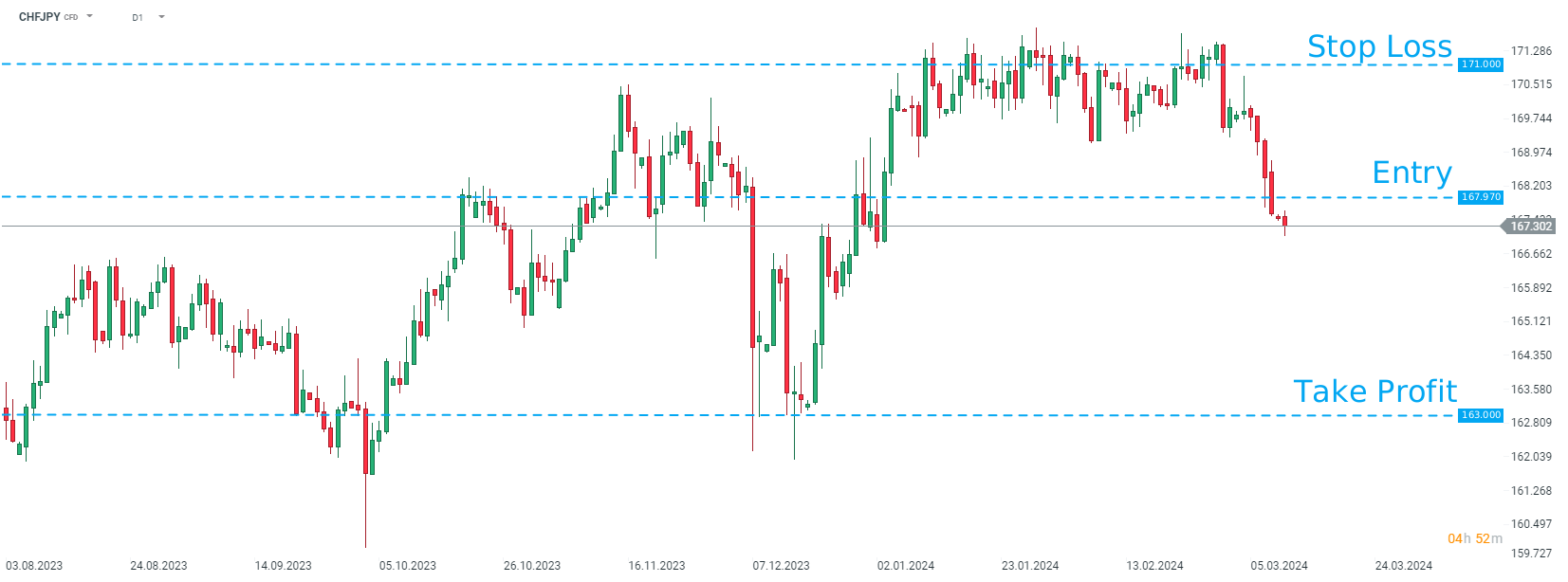 MUFG recommends taking a short position on CHFJPY at market price with a target of 163.00 and a stop loss order placed at 171.00. Source: xStation5
