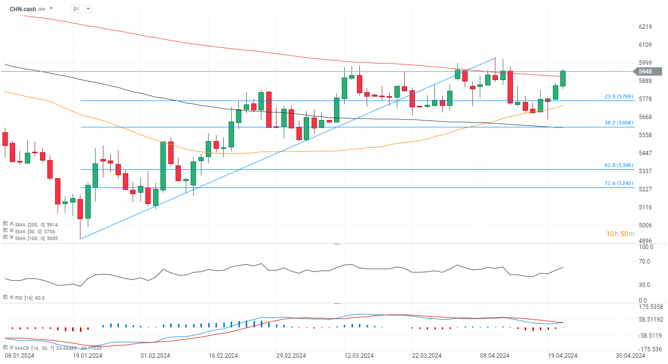 China's CHN.cash index is gaining more than 1% today and has broken above the 200-session moving average (SMA200, red line), which until recently was a very important resistance level. A rise above 6,000 points could herald a test of 6,300 points, the local maxima of November 2023.