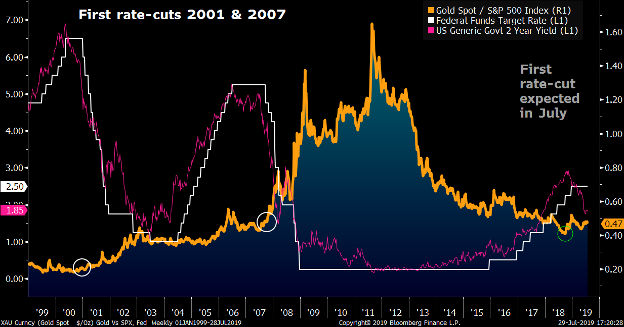- Gold-to-S&P 500 price ratio suggests that the precious metal outperformed broad equity market during periods of declining interest rates