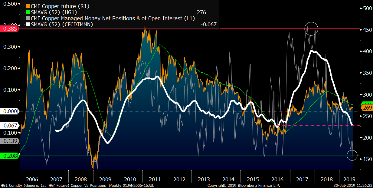 A clear signal that the copper market has become oversold as evidenced by the extremely low net positioning. Source: Bloomberg