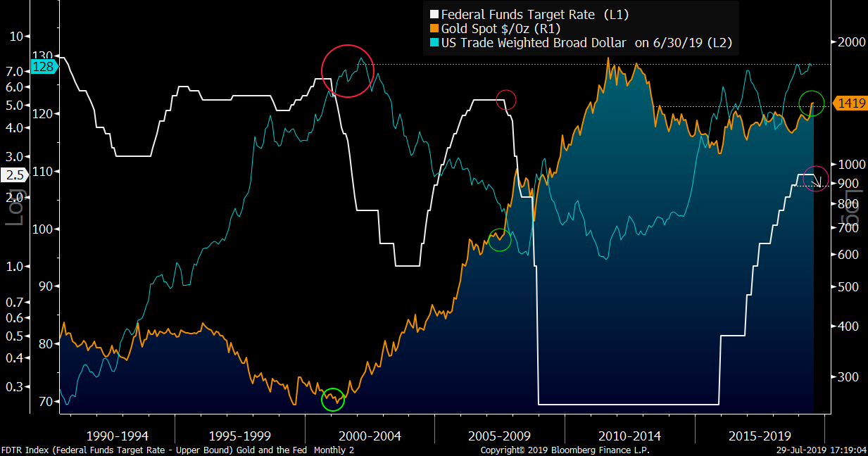 Current situation looks similar to the one from the beginning of the two previous rate cut cycles. Will gold rally 100-200% this time as well? A lot will depend on the performance of the US dollar. As one can see on the chart above, in the early 2000s the US dollar began to weaken several months after the first rate cut was delivered. Source: Bloomberg