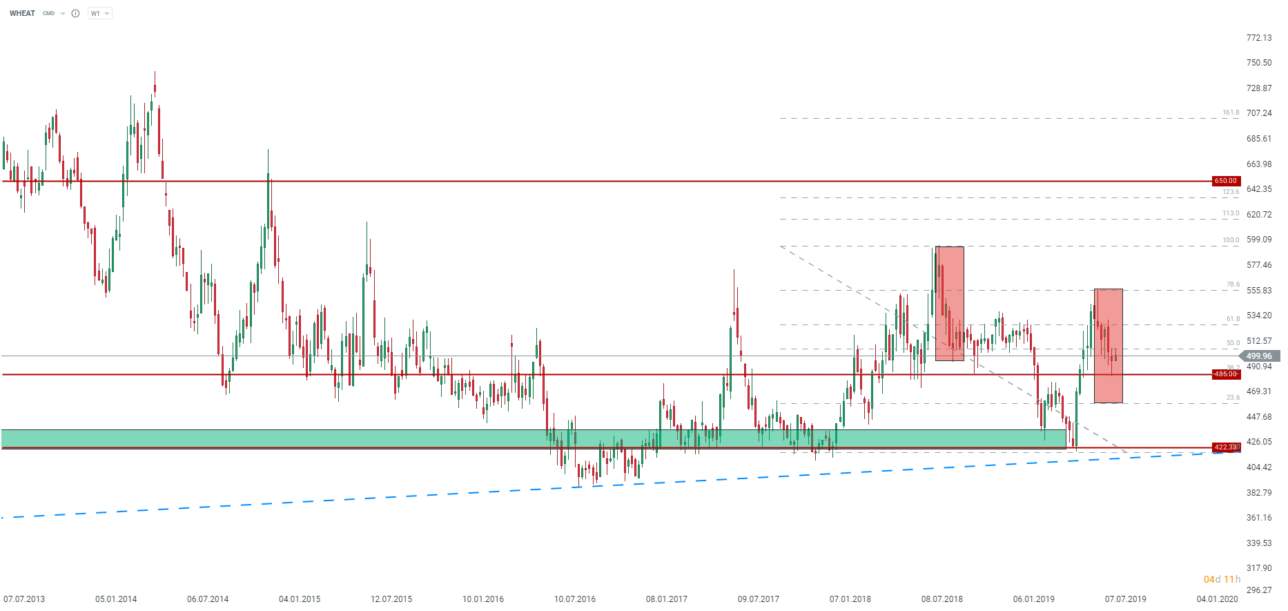 Wheat price tries to bounce off the important support level marked by numerous local lows from 2018. Nevertheless, a pullback towards the 23.6% Fibo level around $450 handle (overbalance structure and long-term support level) cannot be ruled out. Weather conditions over the next 4-6 weeks will be a key factor for the wheat prices. Source: xStation5