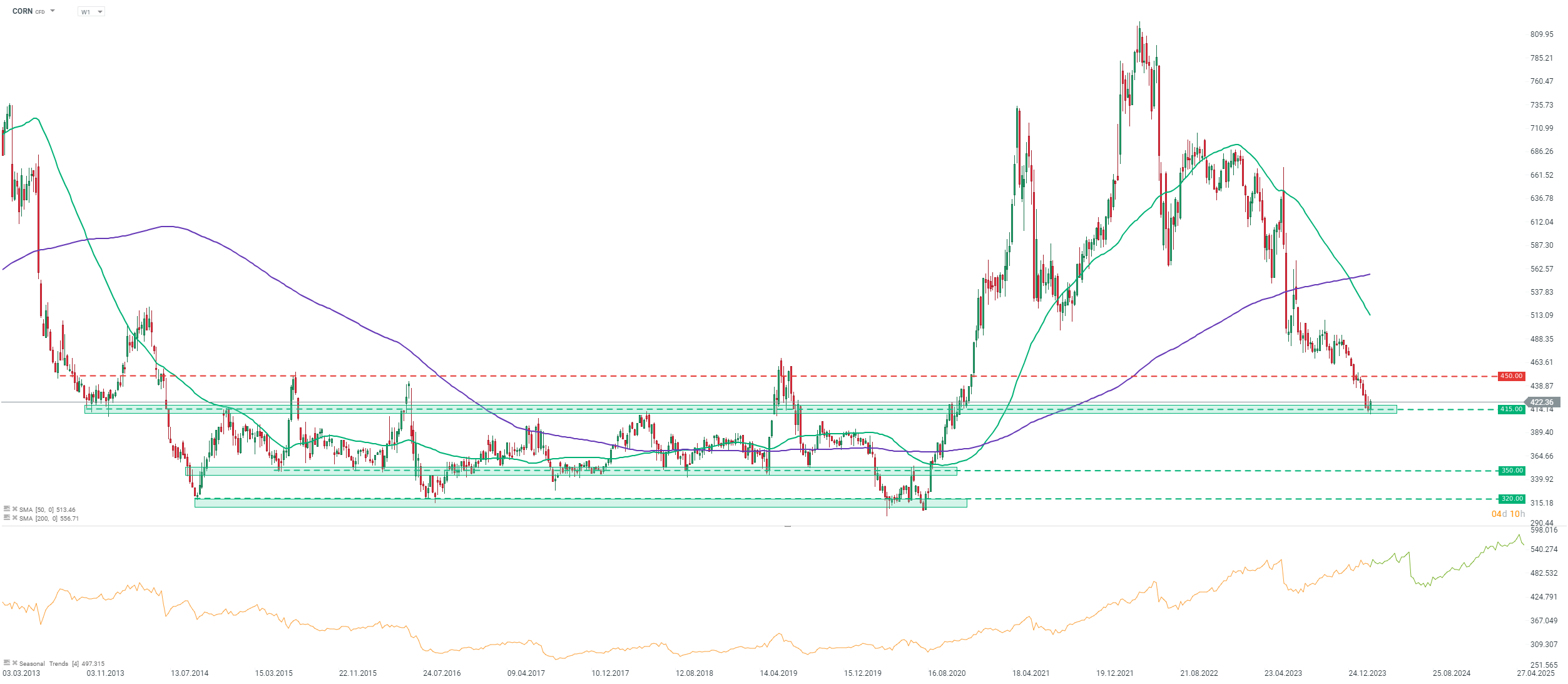 - Seasonal patterns show a possibility of price gain until the beginning of June, when prices often drop due to the beginning of harvest season. However, seasonality also suggested that price should have increased between August 2023 and now, and it was clearly not the case