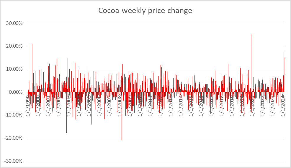 2 out of 4 biggest weekly cocoa price jumps in the past 25 years occurred in February 2024! Source: Bloomberg Finance LP, XTB